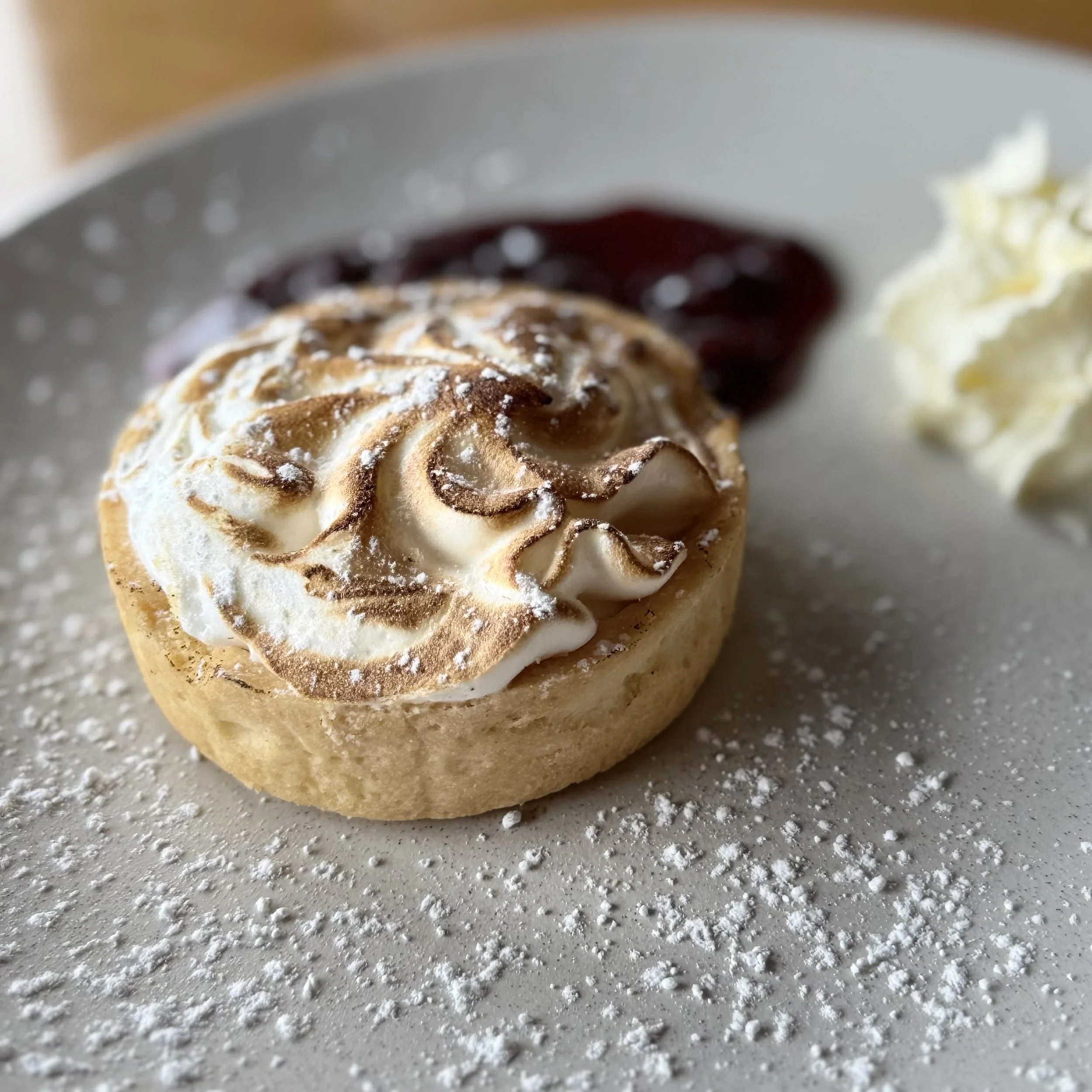 Buttery shortcrust pastry filled with tangy lemon curd, topped with toasted Italian meringue and served with a berry coulis