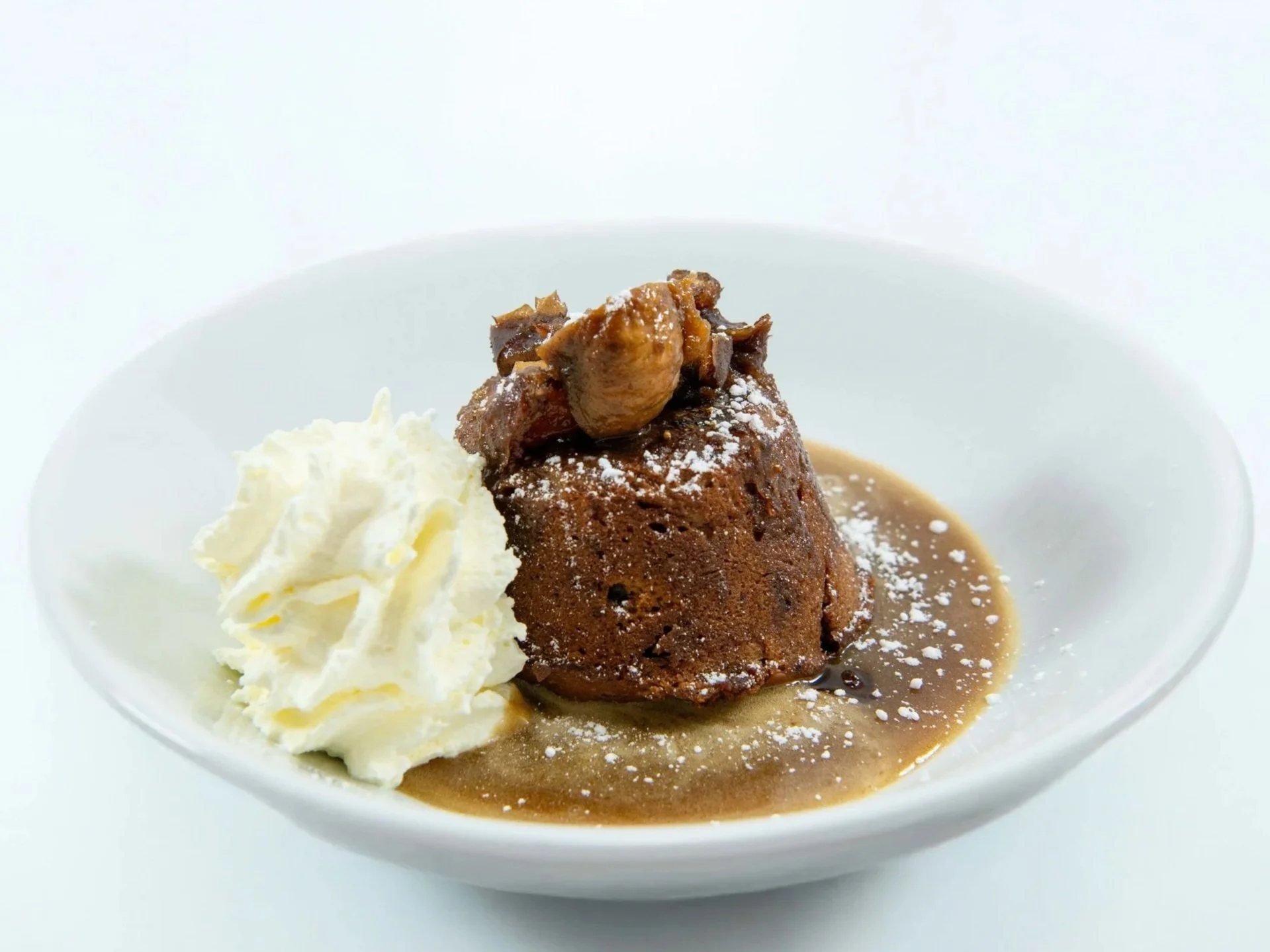 Sticky date pudding served warm with a generous pour of butterscotch sauce—rich, comforting, and full of classic flavour.